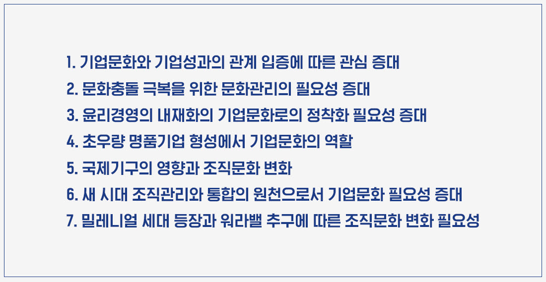 1980년대 초 불길처럼 타오른 기업문화의 유행이 경영학 전반에서 상당한 위상을 차지했었다. 그러나 불과 10~15년 뒤엔 '한 때 유행하고 사라지는 개념(one-time fad)'처럼 취급되었다가, 21세기 들어 기업문화 개념이 부활하여 요즘 더욱 중요시되고 있다. 기업문화가 중요한 객관적 이유는 다음과 같이 7가지로 설명할 수 있다.