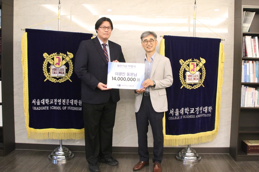 9월 3일 이광진 동문(학사 04)이 서울대학교 경영대학에 발전기금 1천 4백만 원을 약정했다.