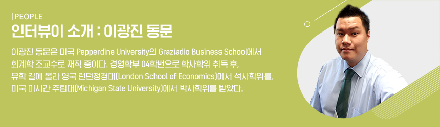 안녕하세요! 다음 세대를 위한 혁신과 이웃을 향한 나눔을 통해 함께 사는 아름다운 사회에 대한 꿈을 이루고자 노력하는 General Specialist 이광진이라고 합니다. 현재 캘리포니아 말리부에 위치한 Pepperdine Graziadio Business School에서 회계학 조교수로 재직하고 있습니다.