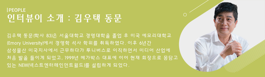 주어진 상황과 과정 속에서 충실하였더니 우연한 기회가 찾아왔다. “옛날엔 미디어 분야에서 방송이 최고였고 극장은 오늘날처럼 큰 주목을 받는 곳이 아니었습니다. 임원진에서 제가 막내라는 이유로 극장 진출 사업을 맡게 되었고, ‘메가박스’ 대표가 되었죠. 당시에는 몰랐지만, 메가박스에서의 경험은 결과적으로 저에게 아주 좋은 기회였습니다.” 김우택 회장은 이를 발판으로 ‘NEW’를 설립하기에 이르렀다. 그의 말을 빌리자면, 삶 속에서 작은 흐름은 스스로 조정할 수 있지만 큰 흐름은 자신의 의지와 무관할 때가 많다. 그렇기에 흘러가는 대로 순응하는 법뿐만 아니라 언제 어느 순간에서든 철저히 준비된 자세가 필요했다.