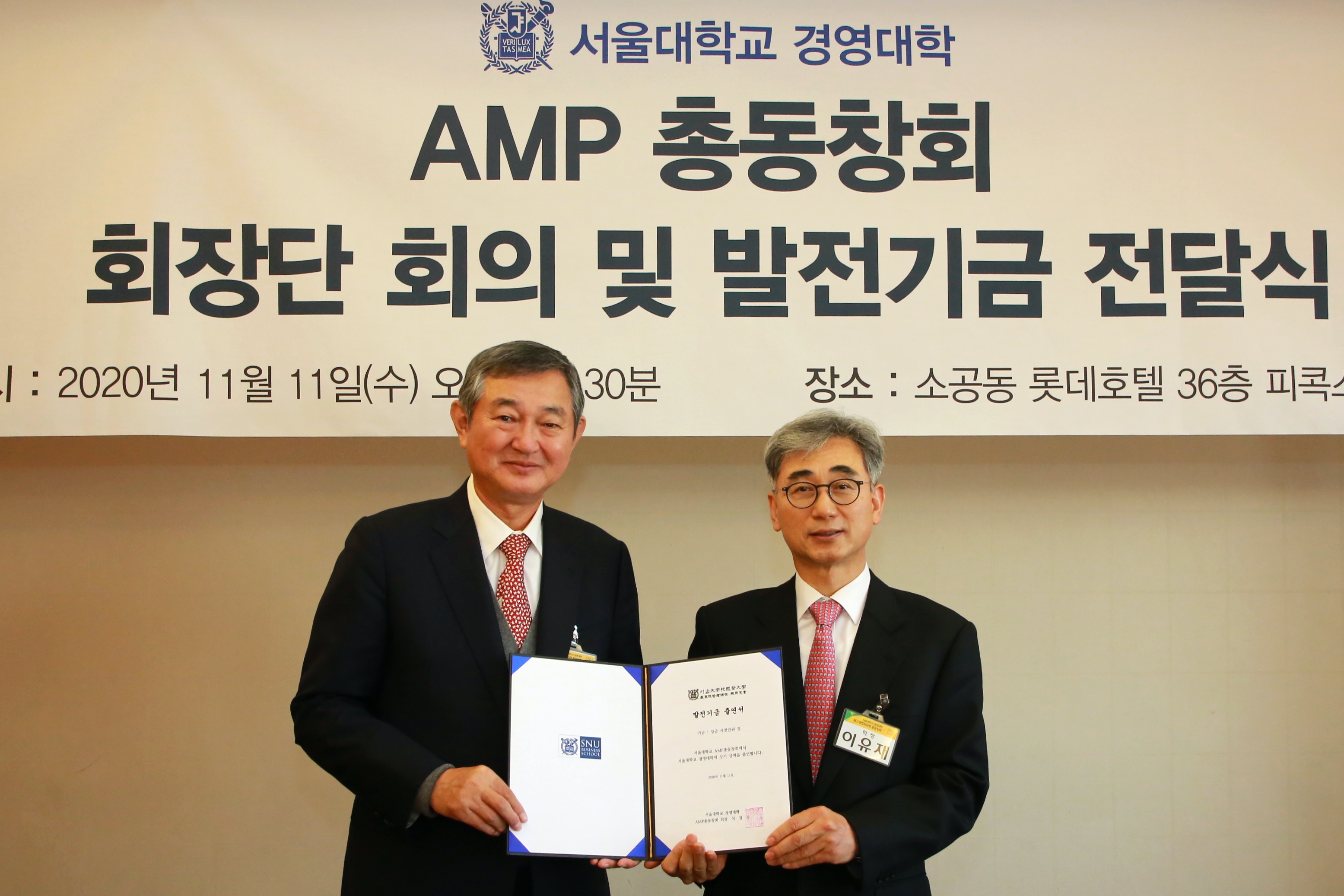 지난 2020년 11월 11일, 소공동 롯데호텔에서 서울대학 AMP 총동창회 회장단 회의 및 발전 기금 전달식이 진행되었다.