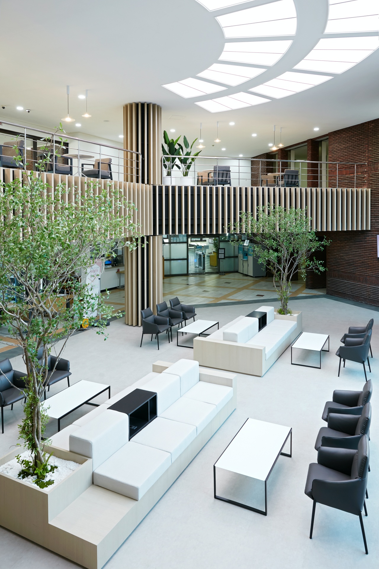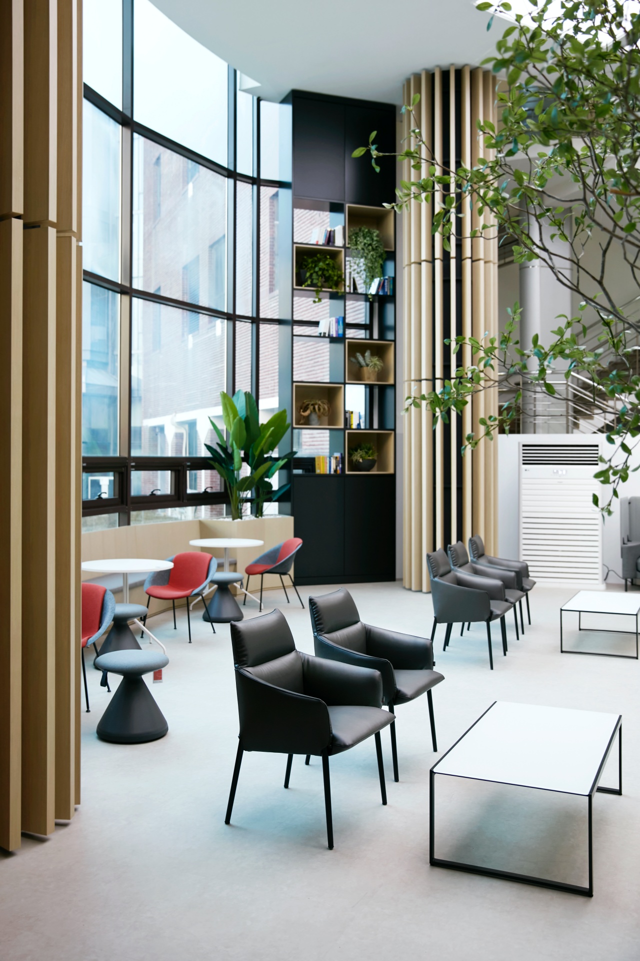 SK경영관의 로비가 그저 스쳐가는 공간이 아니라 경영대의 모든 구성원들이 자유롭게 모이고 활발하게 소통하며, 머무는 동안 에너지와 영감을 얻는 광장(廣場)으로 거듭나기를 바랐습니다. 아늑한 우드 마감을 기본으로, 전면의 유리를 통해 햇살이 비추는 밝고 따뜻한 분위기를 실내로 끌어들이고, 앉아서도 외부 풍경(風景)의 아름다움을 편안히 느낄 수 있도록 건물의 안과 밖이 단절되지 않으면서 하나의 장소(場所)로 자연스럽게 조화되는 커뮤니티 공간을 조성하고 싶었습니다.