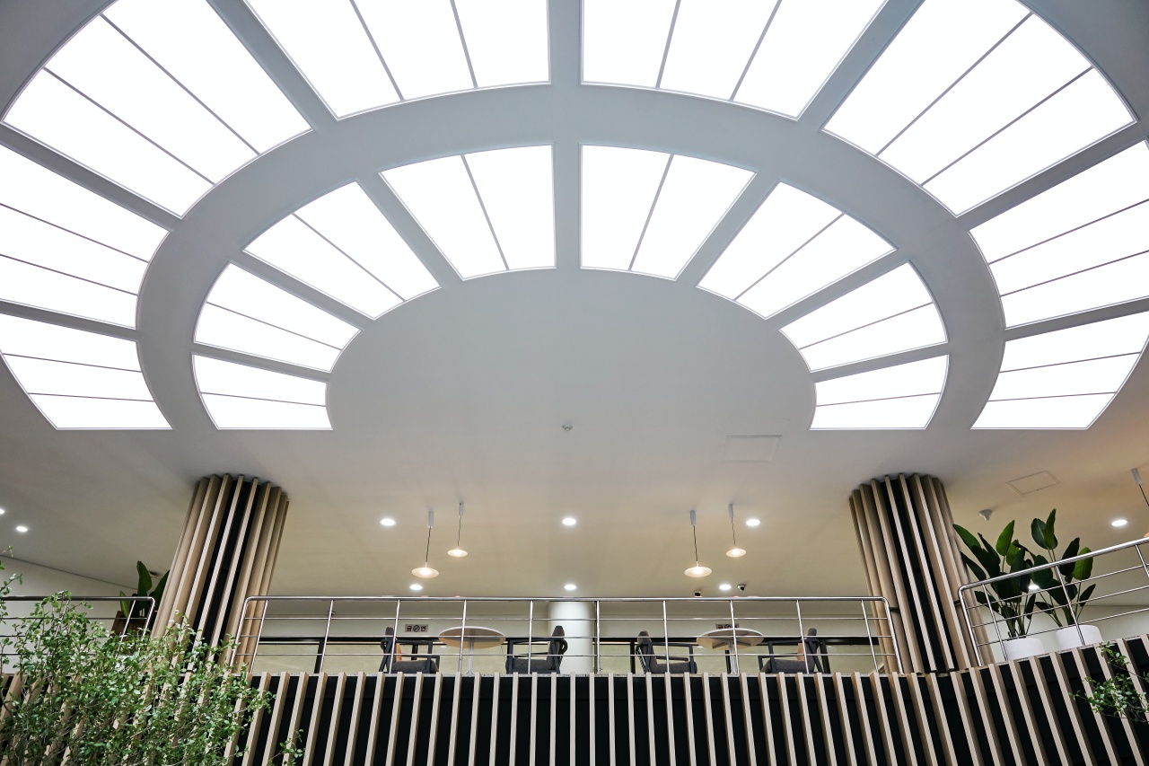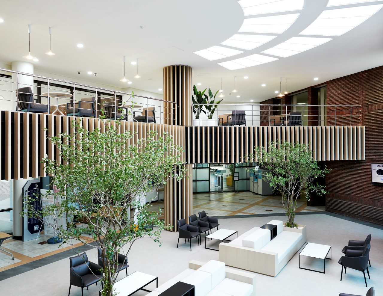 SK경영관의 로비가 그저 스쳐가는 공간이 아니라 경영대의 모든 구성원들이 자유롭게 모이고 활발하게 소통하며, 머무는 동안 에너지와 영감을 얻는 광장(廣場)으로 거듭나기를 바랐습니다. 아늑한 우드 마감을 기본으로, 전면의 유리를 통해 햇살이 비추는 밝고 따뜻한 분위기를 실내로 끌어들이고, 앉아서도 외부 풍경(風景)의 아름다움을 편안히 느낄 수 있도록 건물의 안과 밖이 단절되지 않으면서 하나의 장소(場所)로 자연스럽게 조화되는 커뮤니티 공간을 조성하고 싶었습니다.
