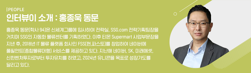 홍종욱 동문은 국내 최대 플랫폼이라 할 수 있는 네이버에 ‘물류’가 비어 있다는 생각을 2017년도부터 했다. 사실 티몬으로 이직한 이유도 물류 자동화를 도입하여 사업의 경쟁력을 더욱 강화하고자 하였는데, 상황이 여의치 않아서 퇴사 후 회사를 차리게 된 것이다. “지금은 웃으면서 이야기하지만, 창업 후 첫 2년은 굉장히 힘들었어요. 주변 사람을 설득하는 일도 쉽지 않았고, 사람을 모으기도, 자금을 모으는 일도 어려웠죠. 하지만 고된 시간이 지나, 어느 정도 자리를 잡았고 투자도 관심도 곳곳에서 많이 받고 있습니다.” 힘들었던 시간을 덤덤하게 웃으며 표현하는 홍종욱 동문에게서, 그간의 시행착오와 그로부터 얻은 단단한 마음가짐을 엿볼 수 있었다. “사업 확장을 위한 시장 조사에서, 타사가 우리 회사를 벤치 마크하고 있고, 견제를 많이 하고 있다는 것을 알 수 있는데, 한편으로는 뿌듯하면서도 다른 한편으로 긴장을 늦추지 않겠다 다짐하고 있습니다.” FSS라는 이름으로 시작한 홍종욱 동문의 회사는 최근 FASSTO라는 이름으로 새롭게 출발했다. 여담으로 FASSTO라는 좋은 이름을 얻기 위해 참 많은 고민을 했었고, 95학번의 이진준 옥스퍼드대 교수와 같은 대학의 언어학자까지 참여해 브랜딩을 도와주셨다고 한다. 입에 잘 감기는 이름이라, 상당히 만족하고 계신다고 한다.