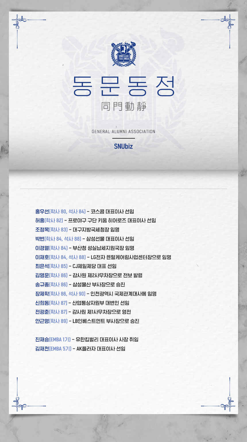 서울대학교 경영대학(원) 동문의 최신 동정입니다. (2021년 03월 기준)
