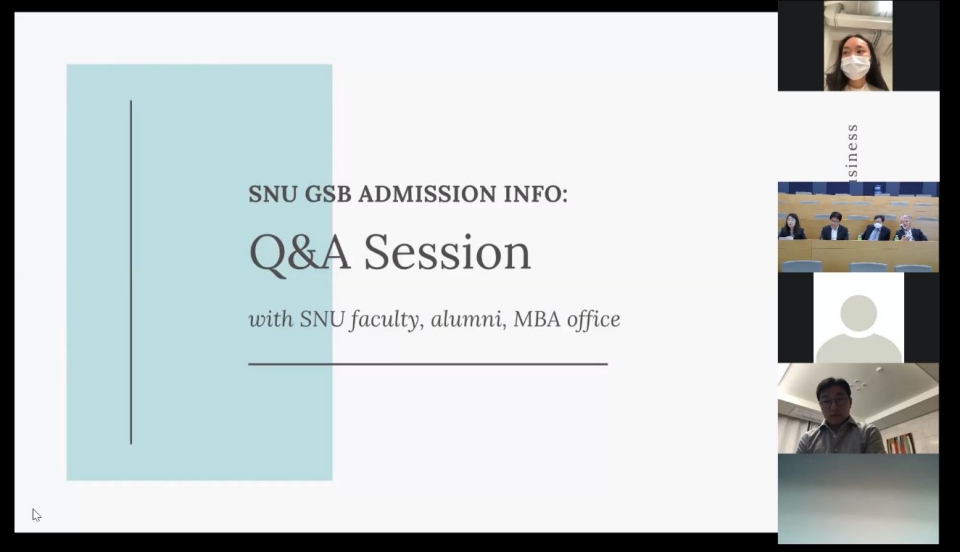 경영전문대학원은 2021년 2월 25일(목) Full-time MBA 입학설명회를 실시하였다. 줌(Zoom) 화상회의를 통해 비대면으로 진행된 이번 설명회에는 최종학 MBA부학장, 김우진 주임교수가 참석하여 실시간 질의응답을 제공하였다. 또한 GMBA 1기 졸업생으로 삼성증권 IB부문 이사로 재직 중인 김도영 동문과, 2월 졸업한 SMBA 13기 조희영 동문, 현재 GMBA 15기의 학생회장을 맡고 있는 최재혁 재학생이 대표로 함께 참석하였다. 행사에는 60명에 달하는 예비 지원자가 몰려 2021학년도부터 1년제 과정으로 통합되는 Full-time MBA 과정을 향한 열띤 관심을 보였다.