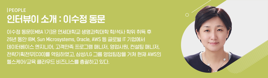 안녕하세요? 저는 아마존 웹 서비스에서 Head of Education으로 일하고 있는 이수정입니다.