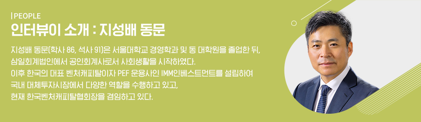 ‘IMM’은 국내 PEF와 VC를 선도하는 기업이다. 한국벤처캐피털협회 협회장을 또한 재임하고 계신 지성배 대표님은 책임감과 진솔함이 돋보이는 분이셨다. 수많은 기업의 자생과 성공을 이끌어내어 한국 경제구조 개선의 마중물 역할을 하고 계신 대표님을 만나보았다.