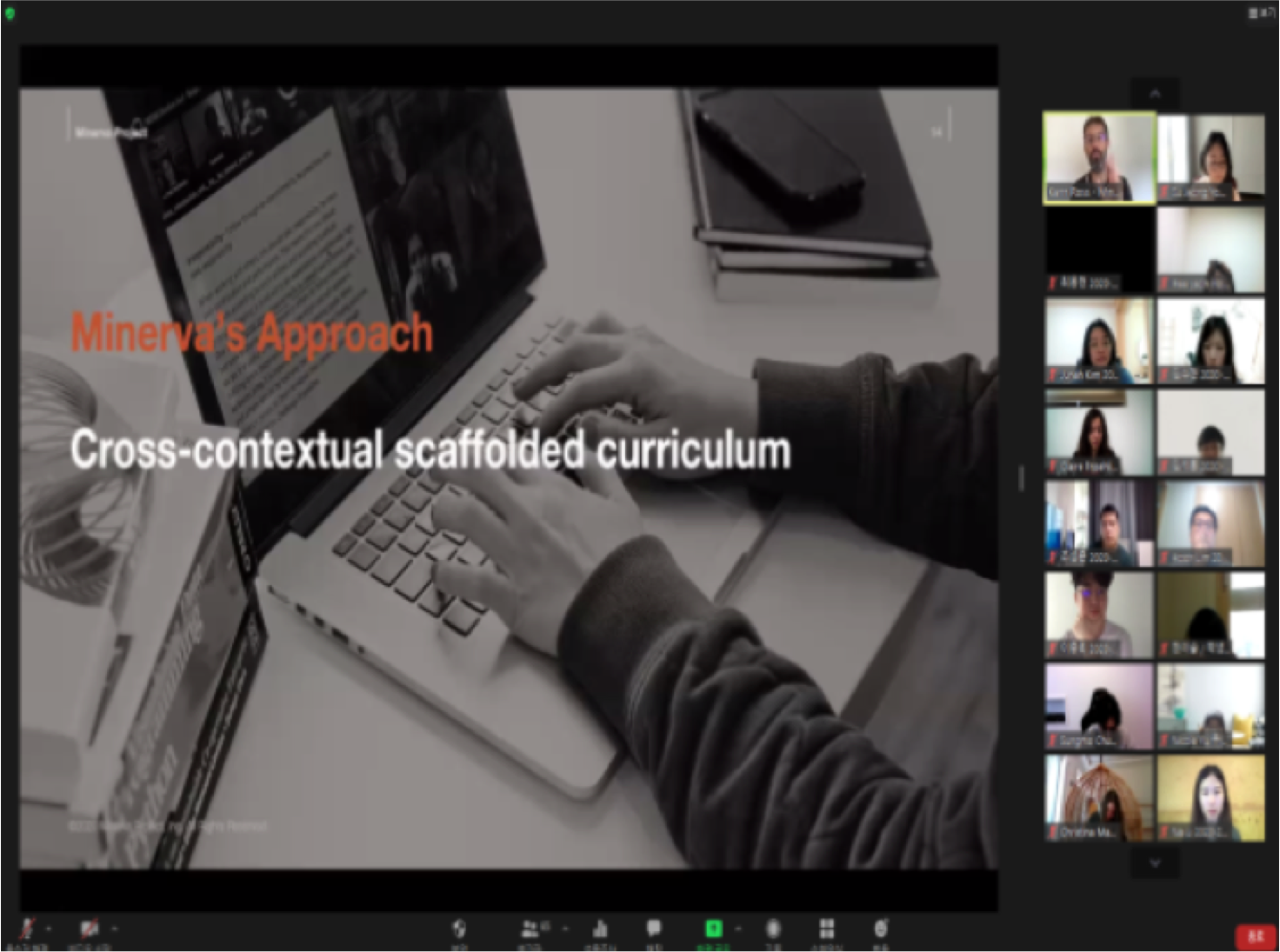 경영전문대학원은 지난 4월 2020학번 G,SMBA 재학생들을 대상으로 진행되는 Global Ledaers Series 특강에 미네르바스쿨 아시아디렉터 켄 로스를 초청하였다. Global Leaders Series는 리더십을 주제로 하여 국내외 경영 인사들의 경험과 조언을 공유하는 특강이다. 4월 16일(금) 코로나19 상황을 고려하여 비대면 줌 미팅으로 열린 이번 특강에서, 켄 로스 디렉터는 대만에서 접속하여 강연함으로써 “국경 없는 캠퍼스”의 예시를 보여주었다.