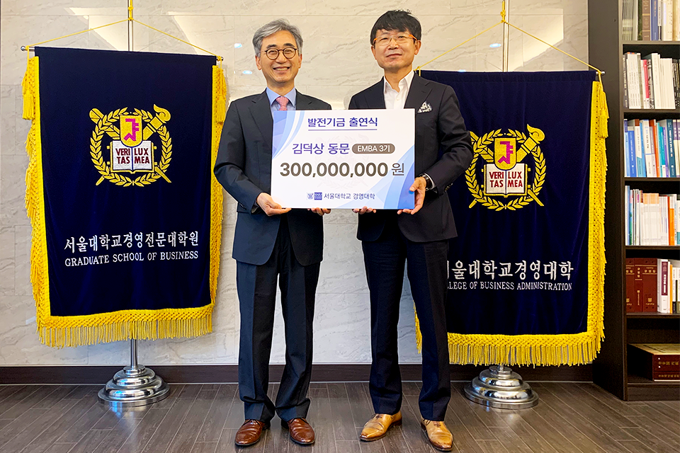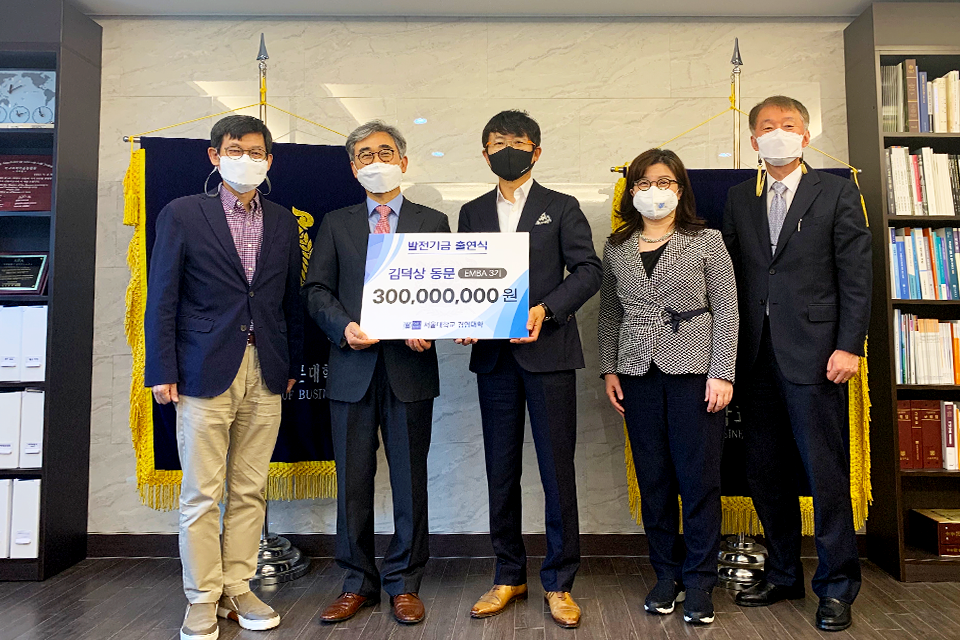 지난 5월 11일 서울대학교 경영대학 학장실에서 김덕상 동문(EMBA 3기)의 발전기금 출연식이 있었다. 이날 행사에는 이유재 경영대학(원)장을 비롯해 김상훈 교무부학장, 이경미 학생부학장, 최종학 MBA부학장이 참석하여 감사한 마음을 전했다.