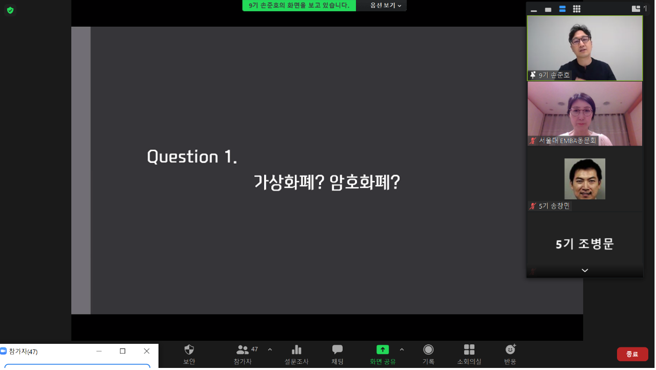 EMBA 동문들의 지속적인 성장과 동문회 활성화를 위해 2019년부터 활동 중인 4개 분야의 Experts 그룹 가운데, 2021년 첫 번째 세미나는 금융투자그룹의 가상화폐로 시작했다.