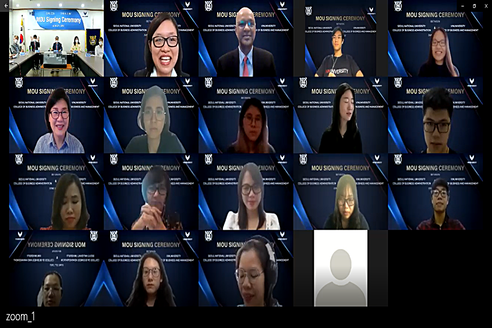 지난 6월 22일 서울대학교 경영대학은 베트남 VinUni CBM과 일반 학술교류 협정 체결식을 비대면으로 진행했다. 이날 협정 체결식에는 서울대학교 이유재 경영대학장, 김상훈 교무부학장, 이경미 학생부학장, 최종학 MBA 부학장, 송인성 경영연구소장과 VinUni Rohit Verma 총장, Sunmee Choi 학장 등이 참석한 가운데 양측의 소개와 인사를 주고받으며, 화기애애한 분위기 속에 체결식을 마무리했다.