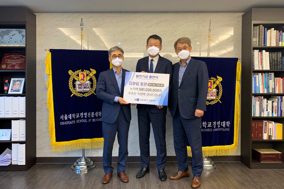 지난 7월13일(화) MBK파트너스 대표로 활동중인 김광일 동문(학사 84, 석사 89)이 ‘덕송장학금’에 1억 원을 쾌척하였다. 이날 발전기금 출연식은 서울대학교 경영대학 학장실에서 진행되었고, 이유재 경영대학장, 곽수근 명예교수가 참석하여 자리를 빛냈다.
