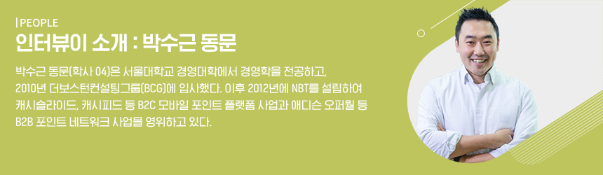 데일리 미션과 보상, 마케팅을 결합한 애플리케이션 ‘캐시슬라이드’를 개발한 NBT의 대표 박수근 동문(학사 04)께서 본인과 NBT를 소개하시며 해주신 말씀이다. 지난 6월 29일, ‘다음의 새로움에 도전한다‘는 사명을 가진 매력적인 아이디어 뱅크 NBT를 방문하여 박수근 동문의 말씀을 청해 들었다. 유쾌한 언사와 밝은 웃음으로 홍보대사들에게 회사 전경과 업무 체계를 설명해주시고, 편안한 분위기로 적극적으로 인터뷰에 임해주신 박수근 동문께 깊은 감사를 드린다.