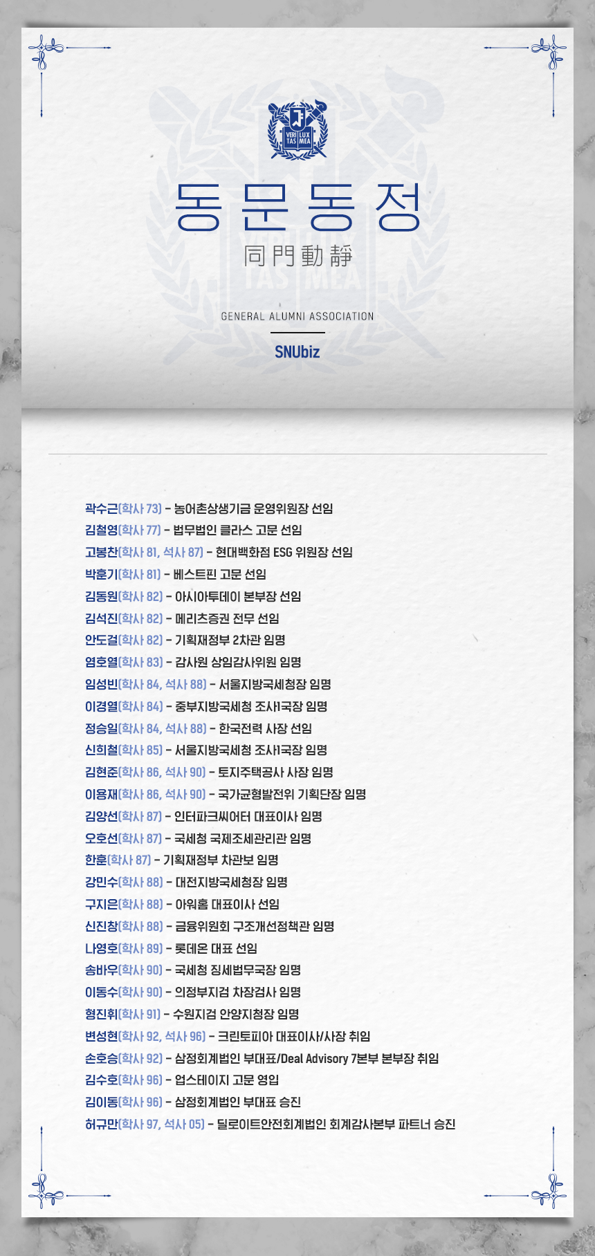 서울대학교 경영대학(원) 동문의 최신 동정입니다. (2021년 09월 기준)