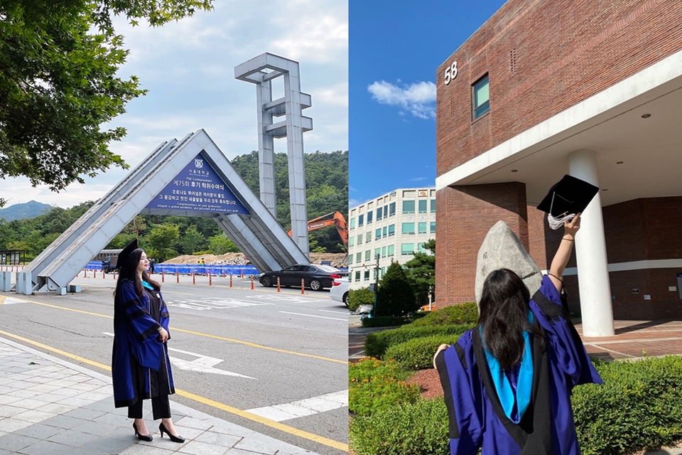 코로나 19로 인해 대면 수업을 한 학기만 겪었던 2019학년도 후기 입학생인 저에게 가장 익숙한 캠퍼스의 전경은 푸르게 핀 잔디 위로 점차 단풍이 들다가, 노랗게 마른 잔디 위로 앙상한 가지의 그림자가 드리우던 풍경이었습니다. 서울이라는 복잡한 도시 한 가운데 동떨어진 숲처럼 자연과 어우러진 관악 캠퍼스의 사계절을 양껏 즐기지 못한 아쉬움도 채 가시기 전에, 2년이라는 시간이 쏜살같이 흘러 어느덧 졸업을 맞이하게 되었습니다. 확진자 수가 급증한 만큼, 가족들 혹은 동문들과 보낼 시간이 제한될 수밖에 없었기에 여름의 녹음이 가득한 아름다운 캠퍼스의 졸업식은 조금은 잔잔하였고, 또 다소 아쉬움이 가득하였습니다.