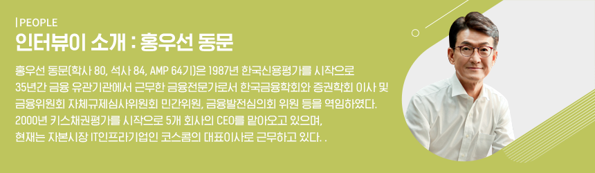 대표님께서 KIS채권평가 대표이사, 한국채권연구원 연구위원, 나이스D&B 대표이사, 나이스정보통신 대표이사 등 많은 경력을 지니고 계시는데 다양한 커리어를 거치게 된 대표님의 여정이 궁금합니다.