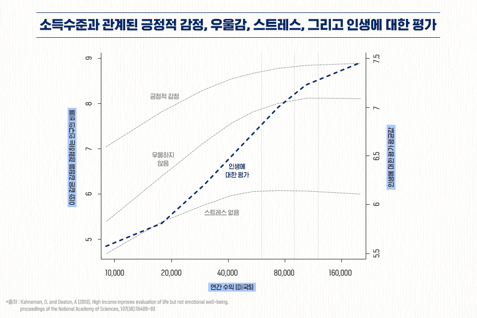 누구에게나 주어진 인생이지만, 모든 이가 행복하진 못하는 현실에서 우리는 자신을 위하여 또는 사랑하는 가족을 위하여 소득향상을 하는 것이 곧 인생의 행복으로 연결된다고 생각하는 경우가 많은 것 같다. 커너맨과 디튼의 연구는 교육과 기회 향상을 통한 경력상 그리고 사회경제적 성공을 통하여 소득이 향상될 때 우리의 인생에 대한 평가가 좋아질 수 있지만, 그러한 효과가 일정 수준의 소득수준 이상에서 한계가 있다는 점을 지적한 것에 있어, 그리고 일상의 행복을 찾기 위해서는 또 다른 노력이 필요하다는 점에서 우리에게 시사하는 바가 크다. 당신의 행복을 위해서 소득수준을 높이는 것은 중요해 보인다. 그러나 또한 일상의 소소한 행복을 찾기 위한 노력도 그에 못지않게 필요해 보인다. 하지만 커너맨과 디튼의 연구를 단순히 행복을 결정짓는 데 있어 소득수준의 한계를 짚은 연구로만 해석하는 것은 무리인 듯하다. 왜냐하면 인생에 대한 평가와 감정적 행복은 서로를 대체할 수 없어 보이며 인생에 대한 평가는 오랫동안 꾸준한 투자를 통하여 이루어지고 건강한 삶과 좋은 대인관계 또한 건전한 습관과 한결같은 마음에서 이루어지기 때문이다. 이 연구는 인생에서의 행복이 마음먹은 것처럼 쉽지 않고 끊임없는 노력을 통해 이루어짐을 보여준다.