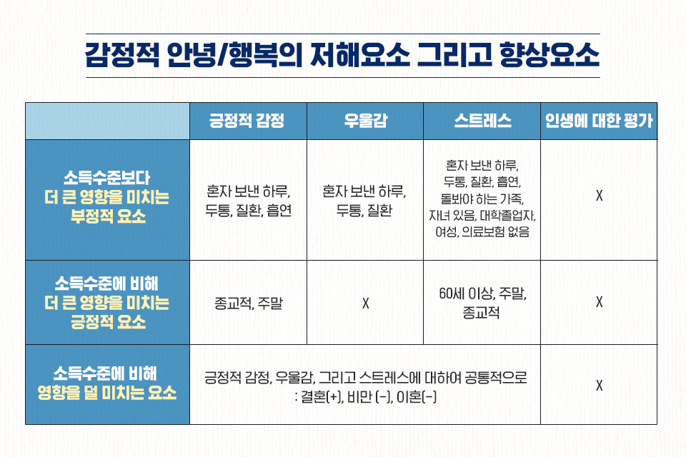 소득수준에 비해 감정적 행복을 더 향상시킬 수 있는 요소로서 그날의 감정적 행복의 평가가 주말의 느낌에 대해 이루어졌나의 여부인데, 일반적으로 주말에는 스트레스가 부재하고, 긍정적인 감정이 더 많음을 확인하였다. 소득수준에 비해서는 효과가 덜하지만 주말효과는 우울감도 줄인다. 이 결과는 일 이외의 레져타임이 많을수록 감정적 행복이 향상될 수 있음을 의미한다. 또한 60세 이상의 사람들이 소득수준이 스트레스를 줄이는 정도보다 더 크게 스트레스를 줄이고, 소득수준보다 덜 영향을 미치나 다른 감정적 행복(긍정적 감정 그리고 우울감)에도 향상요소로 작용함이 발견되었다. 그리고 종교적인 사람들이, 소득수준이 높은 사람들이 겪는 효과 이상으로 더 긍정적 감정을 더 경험하고 스트레스 레벨도 더 적음도 발견되었다. 이러한 감정적 행복의 저해 그리고 향상요소를 필자가 표 1로 정리해 보았다.