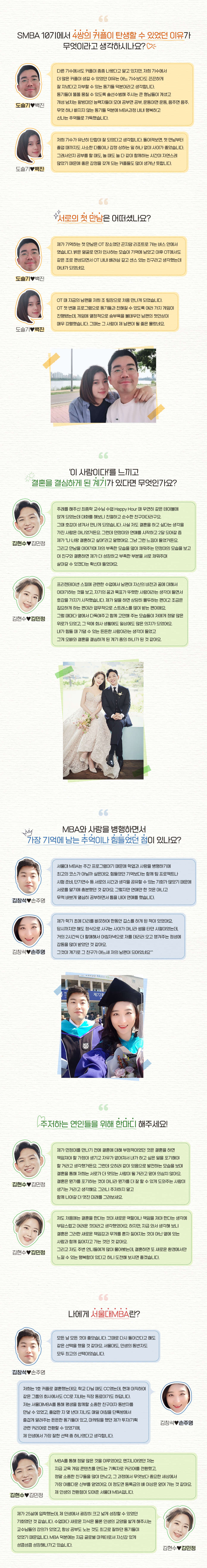 2016년 8월 입학한 SMBA 10기 동기 80명 가운데 무려 4쌍의 커플(김창석♡손주영, 도슬기♡백진, 김현수♡김민정, 한상우♡김강재)이 탄생했다. 이들 중 세 커플을 인터뷰하여, 이렇게 많은 커플이 탄생한 비결과 러브 스토리에 대해 들어본다.