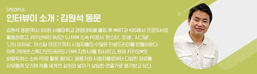 KBS에선 <파트너>, <신데렐라 언니>, <성균관 스캔들> 등을 연출했습니다. 이후 MNET에서 저를 가르쳐 주셨던 선배님이 함께 드라마를 만들어보자고 권유하셔서 CJ ENM으로 직장을 옮기게 되었습니다. 스튜디오드래곤은 CJ ENM에서 분사한 회사였기에 자연스럽게 넘어왔습니다. CJ와의 계약이 종료된 후 마음이 맞는 프로듀서와 바람픽쳐스라는 회사를 만들었는데 이 회사를 2020년 카카오M이 인수하면서 카카오에 둥지를 튼 셈이 되었습니다.