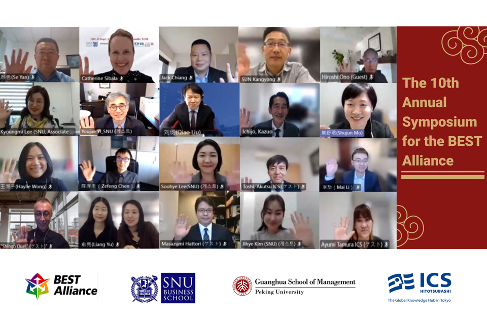 지난 11월 12일 제10회 BEST Alliance Symposium 이 개최되었다. 서울대학교 경영대학은 중국의 북경대학교 및 일본의 히토츠바시대학과 함께 교육, 연구, 산학협력을 아우르는 전방위적 동맹 결성을 위한 BEST Business School Alliance 협정을 2012년에 최초로 체결하였다. 매해 서울대학교 경영대학(대한민국), 북경대학교(중국), 히토츠바시대학교(일본)를 순회하며 정기 회의를 개최하였으며 COVID-19 사태로 인해 작년 비대면 심포지엄에 이어 올해 2021년에도 북경대학교의 주최 하에 Teams 비대면으로 심포지엄을 실시하였다. 참석자로는 각 학교의 학장단, 교수진 및 교직원이 참석하였으며, 서울대학교 경영대학에서는 이유재 학장, 이경미 학생부학장, 국제교류실의 이수혜 및 김지혜 직원이 참석하였다.