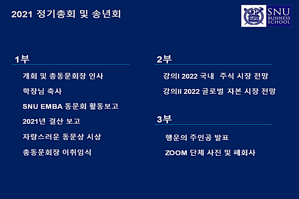 지난 12월 1일 서울대학교 EMBA 총동문회 정기총회 및 송년회가 비대면으로 진행되었다. 100여 명의 동문들이 화상으로 모여, 코로나로 얼룩지고 힘들었던 2021년을 보내며 서로의 안부를 물으며 친목을 다졌다.