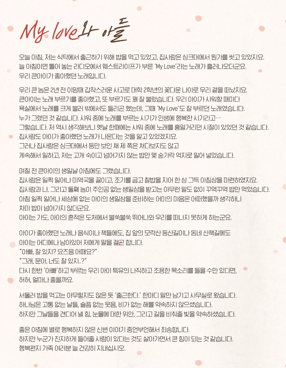 얼마 전 행복편지로 배달된 ‘My love와 아들’이라는 사연이 많은 분의 가슴을 적신 적이 있어 소개합니다.