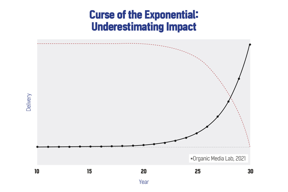 우리의 직관은 미래를 예측할 때 과거의 성장곡선에 우리를 묶어둔다. 10년 후에 기껏 2~3배 성장할 것으로 판단한다. 도표로 설명하자면 다음과 같다. 다음 도표는 2010년에 1만 대도 채 안 되는 차를 판 기업이 매년 50%씩 성장하는 것을 가정하여 그린 것이다. 실제로 2020년도에 50만대를 팔았다면, 함수적으로 2030년도에는 2,883만대를 팔게 된다. 그럼에도 대부분의 사람들은 선형적인 성장(적색 점선)에서 크게 벗어나지 못할 것이라고 예측한다. 그러니 상대의 위협을 과소평가해서 대응의 시기를 놓치게 될 뿐 아니라 니치 제품으로 간주하는 우를 범한다.