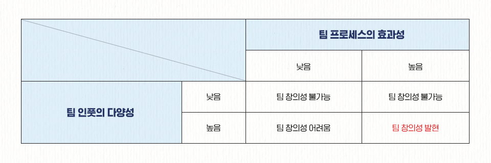 결론적으로 팀 창의성은 팀원들의 다양성이라는 인풋이 다섯 가지 팀 프로세스를 통하여 창의적 문제 해결, 아이디어로 발현되는 과정이다. 팀 인풋이 팀원 다양성을 담보하는 팀 구성을 통하여 쉽게 확보할 수 있는 팀의 하드웨어라면, 팀 프로세스는 팀원들 간의 유동적인 상호작용 과정에 대한 것으로 팀의 소프트웨어라고 할 수 있다. 따라서, 팀과 조직의 리더들이 팀 프로세스를 수시로 점검하고 상황에 맞추어 업데이트할 수 있는 역량을 갖추어야 팀과 조직의 창의적 성과를 도출할 수 있다.