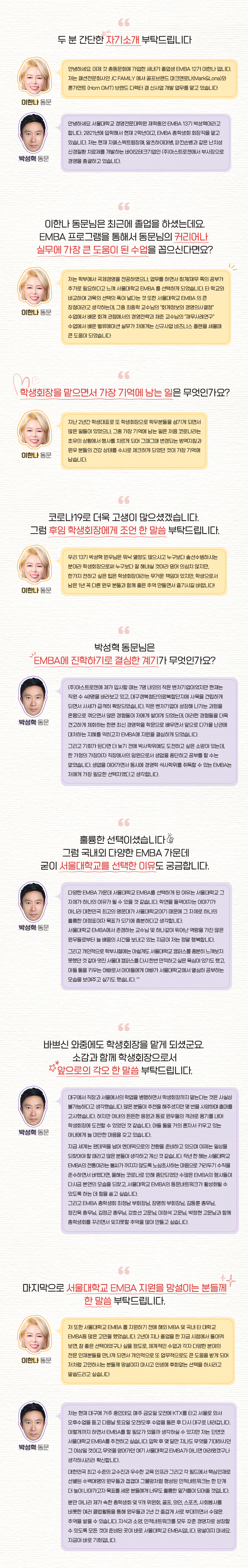 지난 2월까지 EMBA 총학생회 회장을 맡아주신 이한나 동문과 박성혁 차기 회장을 만나보았습니다.