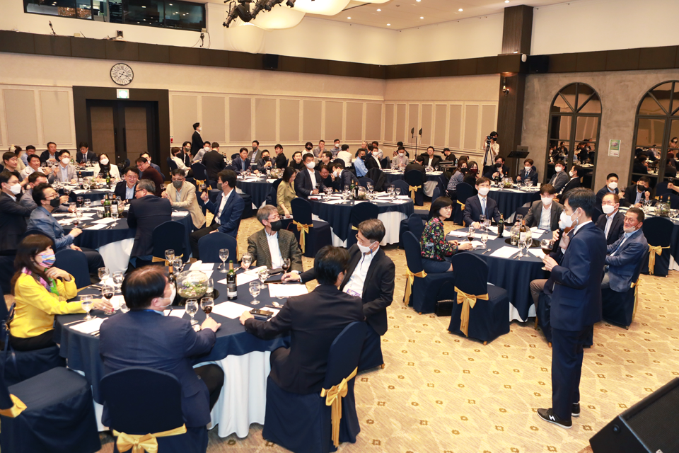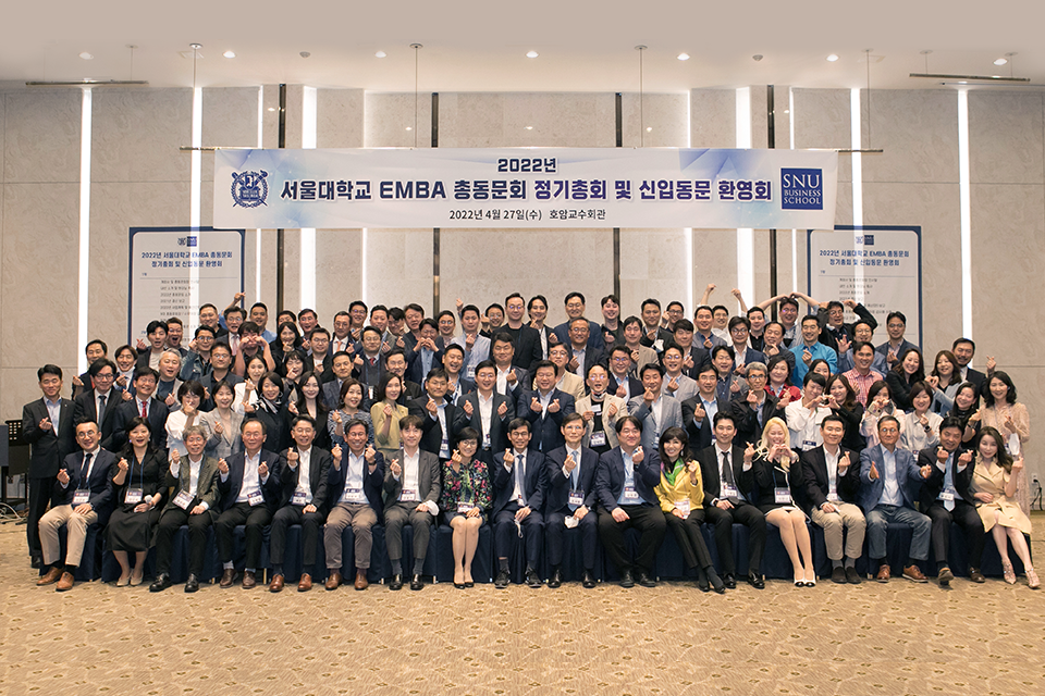 2022년 EMBA총동문회 정기총회 및 신입동문 환영회가 지난 4월 27일(수) 저녁 7시에 호암교수회관 무궁화홀에서 개최되었다. 행사는 제 10대 총동문회장 조세훈(EMBA 6기) 회장의 개회로 막이 올랐다. 21년 결산보고 및 22년 행사계획 발표와 EMBA 12기 졸업생 86명을 신입동문으로 맞이하며 환영식을 이어갔다.