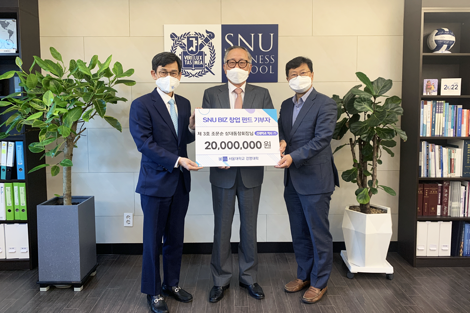 조문순 회장은 지난 4월 29일, 서울대학교 경영대학 학장실을 방문, 2천만원의 발전기금을 기부했다. 이날 기증식에는 김상훈 서울대학교 경영대학 학장과 김우진 학생부학장이 참석했다. 최진남 교수는 지난 4월 30일, 경영대 재학생 및 졸업생의 창업 독려를 위해 300만원을 기부했다.