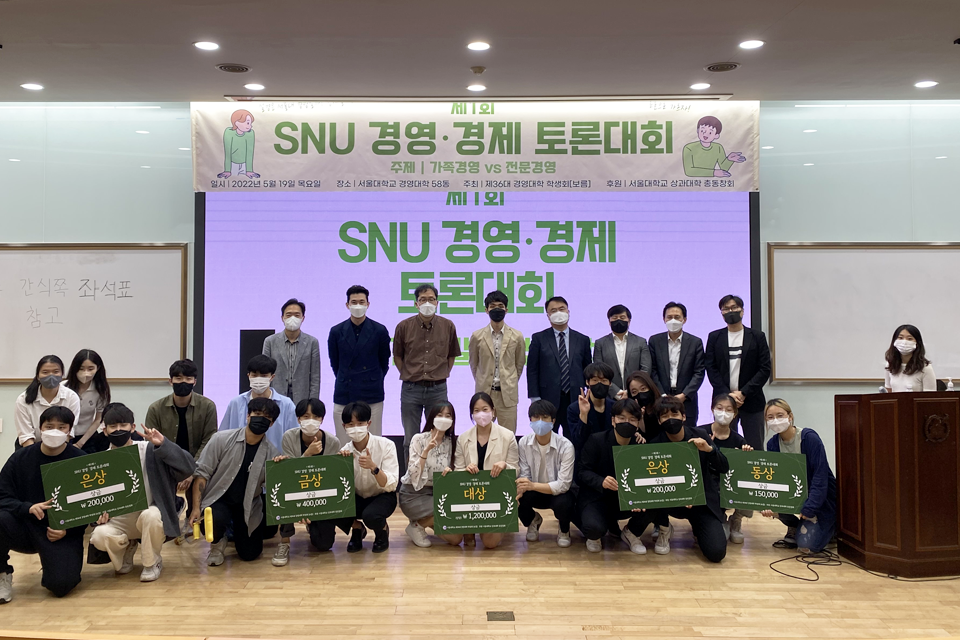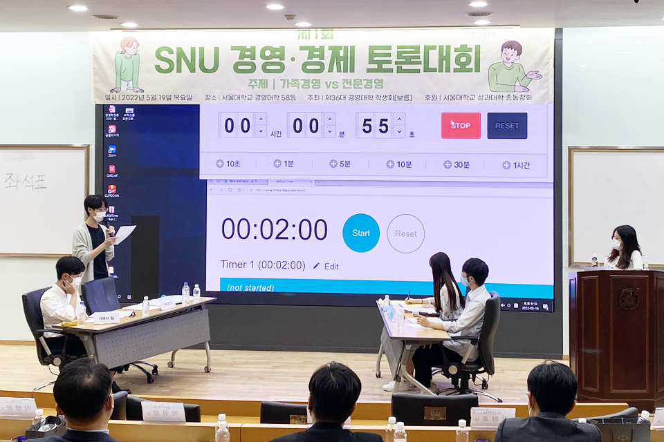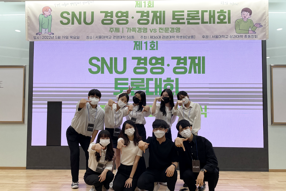 지난 5월 19일(목) 서울대학교 경영대학 58동에서 경영학과 학생들과 경제학부 학생들을 대상으로 한 <제1회 SNU 경영·경제 토론대회>가 진행되었다. 서울대학교 상과대학 총동창회의 후원과 제36대 경영대학 학생회 ‘보름’의 주관으로 개최된 이번 행사에는 예선을 통과한 HMH팀, RGRG팀, 거버넌스팀, 글쓰기의 기초 재수강팀, 327팀, 센애기팀, 설경은 경제팀이 출전하였다. 참가자들은 “가족 경영과 전문 경영 중 어떤 경영방식이 더욱 적합한가”라는 주제로 열띠게 토론하였다.