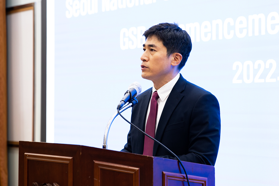 김상훈 경영전문대학원장이 대표 축사를 맡았고 이어서 양홍석 MBA 부학장, 이정연 MBA 주임교수도 졸업생들을 위하여 진심어린 축하의 한마디를 전달했다. 졸업식은 동고동락한 원우들과 교수진이 서로를 격려하고 축하하며, 앞으로는 서울대학교 MBA 동문의 일원으로서 함께하기를 기약하면서 막을 내렸다.