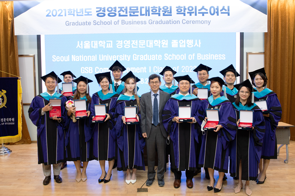2021학년도 후기 경영전문대학원 MBA 졸업식이 지난 8월 29일 경영대학 수펙스홀에서 개최되었다. 1년 동안의 MBA 프로그램을 모두 마무리한 졸업생들과 가족들이 참석하여 소회를 나누고 주인공으로 기억되는 의미 있는 자리가 되었다.