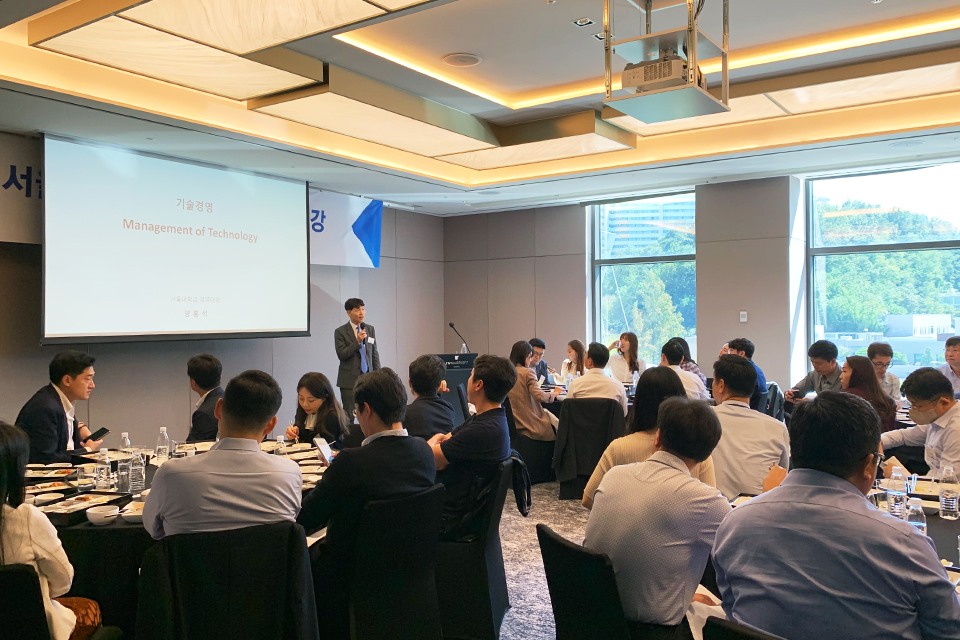 이번 특강에서는 양홍석 MBA 부학장이 강연자를 맡아, “기술경영: Management of Technology”의 주제로 강의하였다. 70명이 넘는 EMBA, SMBA, GMBA 동문들이 참석하여 재학시절처럼 다시 강의를 수강하며 반가운 얼굴들과 함께 식사하는 자리가 되었다.