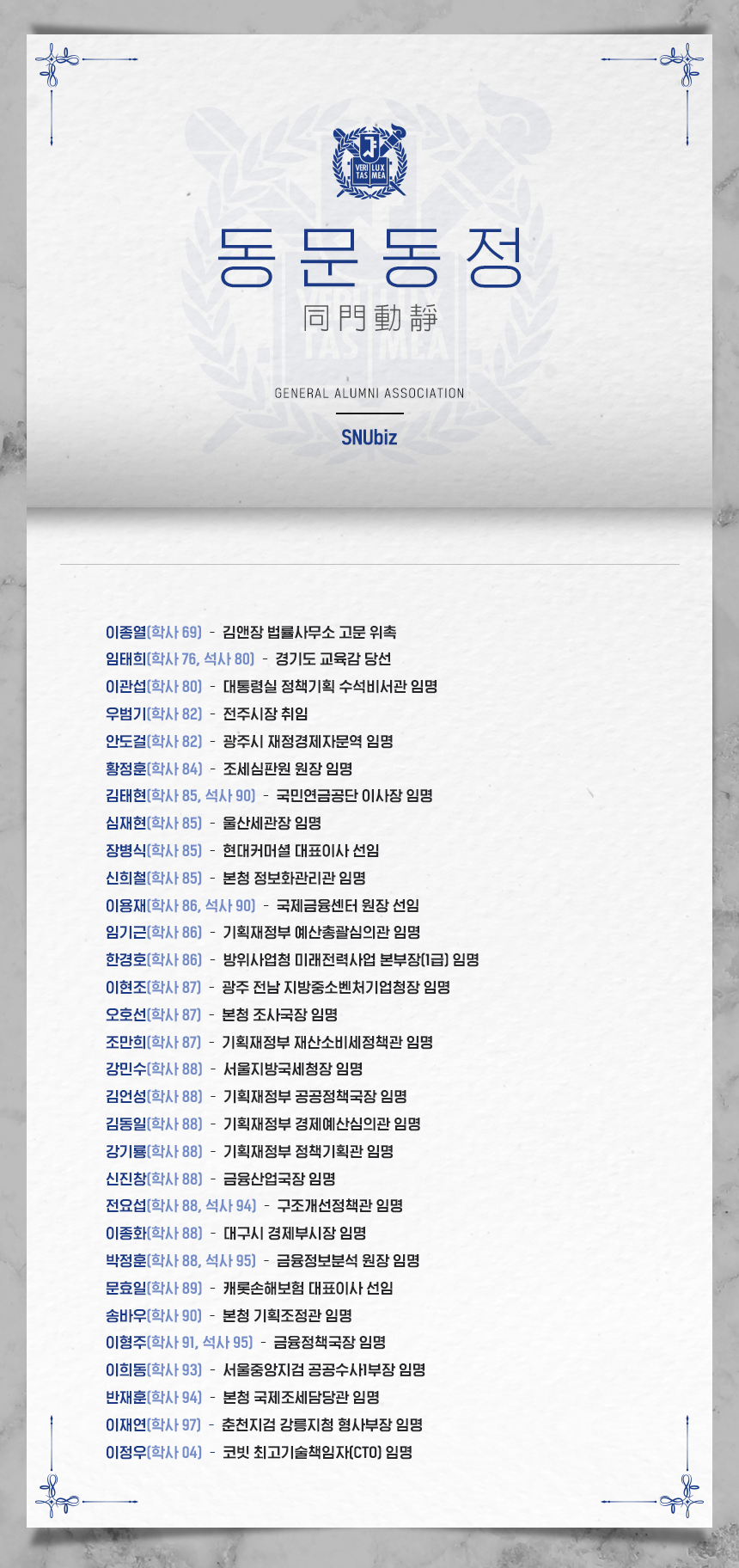 서울대학교 경영대학(원) 동문의 최신 동정입니다. (2022년 11월 기준)