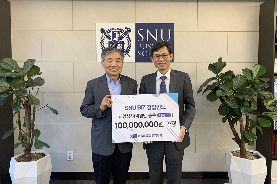 지난 10월 4일, 중견 국적선사인 태영상선 박영안 대표는 서울대학교 경영대학을 방문하여 ‘SNUbiz 창업기금’에 1억 원을 기부하는 약정식을 체결했다.