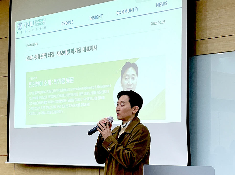 SMBA 7기 문수영 동문의 환영사를 시작으로 하여, MBA 총동문회장을 맡은 SMBA 3기 박기용 회장이 행사를 진행하였다. 또한 총동문회 총무를 맡은 SMBA 3기 계명하 동문, 그리고 SMBA 10기 최재형 동문이 함께 참석하여 지난 2022년 동문 활동을 돌이켜보며 재학생들에게 MBA 총동문회를 소개하였다.