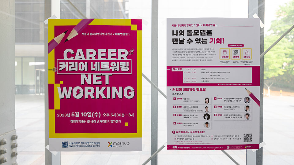 지난 5월 10일 서울대학교 경영대학 59-1동 5층 벤처경영 기업가센터에서 <커리어 네트워킹> 행사가 열렸다. 벤처경영기업가센터와 매쉬업엔젤스에서 공동주최한 이번 행사는 코로나 이후 첫 커리어 네트워킹 행사라는 점에서 학생들의 높은 신청율과 관심을 받았다.