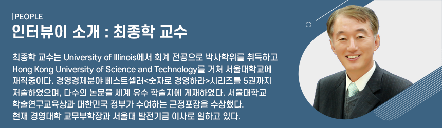 제41회 정진기언론문화상 경제경영도서상 부문에서 경영대학 최종학 교수의 『숫자로 경영하라』가 선정되어 수상의 영예를 안았다. 지난 7월 13일, 서울 중구 매경미디어센터에서 제41회 정진기언론문화상 시상식이 열렸다. 정진기언론문화재단은 매일경제신문사 창업주인 故 정진기 씨의 유지를 계승하기 위해, 독창적이고 창의적인 과학·기술연구, 벤처기업 육성, 지식문화 창조, 경제·경영 도서 저술로 국민문화 및 산업, 사회발전에 이바지한 인물들을 발굴하여 매년 ‘정진기언론문화상’을 시상하고 있다. 이번 제41회 정진기언론문화상은 과학기술연구상, 벤처기업창업상, 지식문화창조상, 경제경영도서상의 4가지 부문을 시상했다. 최종학 교수는 국내 경제·경영 분야 도서 저술로 경제발전에 기여한 저자로서 ‘경제경영도서상’을 수상했다. 영광의 주인공인 최종학 교수님을 직접 만나, 자세한 이야기를 들어보았다.