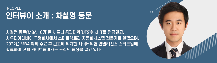 차철영 동문) 저는 판교에 있는 사이버위협 인텔리젼스 회사 에스투더블유(S2W)에서 일하고 있습니다. 저희 회사는 다크웹에서 발생하는 데이터 유출 정보 및 해킹 공격과 같은 각종 외부 위협 정보를 수집∙분석하여 고객사가 선제 대응할 수 있도록 인사이트를 주는 서비스를 제공합니다. 또한 현재 인터폴 및 군 정부 기관, 국내 유명 기업에 저희 회사의 인텔리전스 솔루션을 공급하고 있습니다. 제가 리드하고 있는 라이브팀은 고객 경험 관리를 통해 고객의 니즈를 분석하고 이를 서비스 개선에 적용하며, 회사 내 그레이 영역을 찾아내 이슈화하고 주도적으로 해결하는 역할을 하고 있습니다.