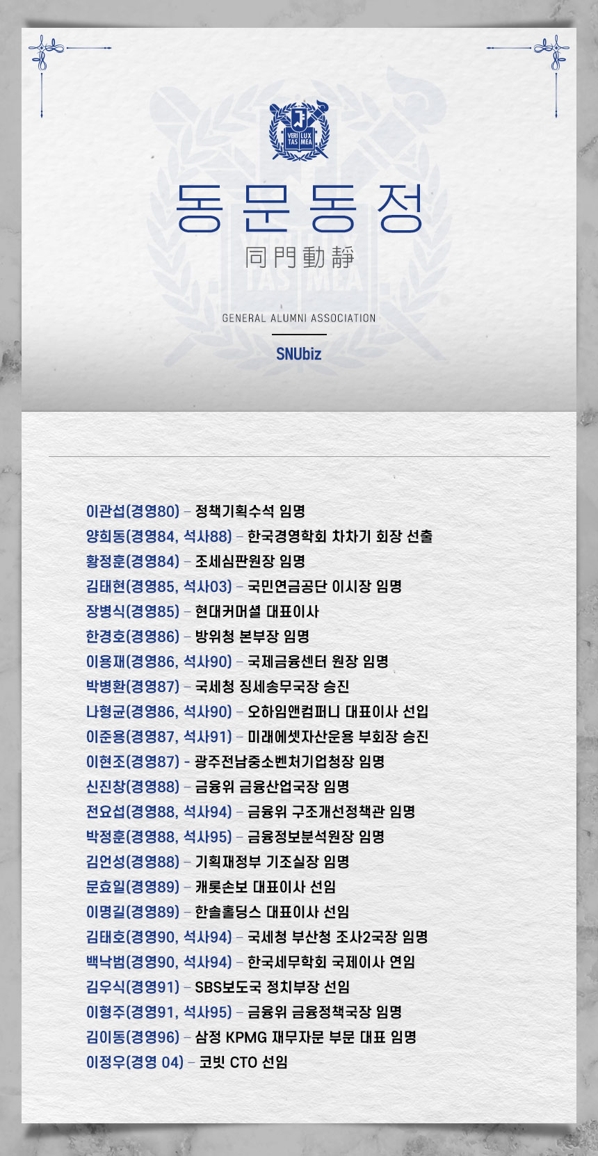 서울대학교 경영대학(원) 동문의 최신 동정입니다. (2024년 1월 기준)