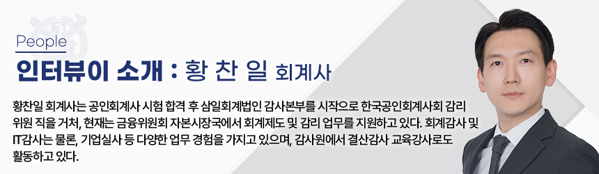 안녕하세요. 서울대학교 EMBA 총학생회장 황찬일입니다. 저는 삼일회계법인 공인회계사로 10년간 회계감사 및 IPO 컨설팅 등을 하였고, 그 경험을 바탕으로 한국공인회계사회 감리위원으로서 관련된 일을 이어가고 있습니다. 현재는 금융위원회 자본시장국에 파견되어 대한민국 회계 및 감리제도 발전에 기여하고 있고, 최근에는 공로를 인정받아 금융위원회 위원장 표창을 수상하였습니다.