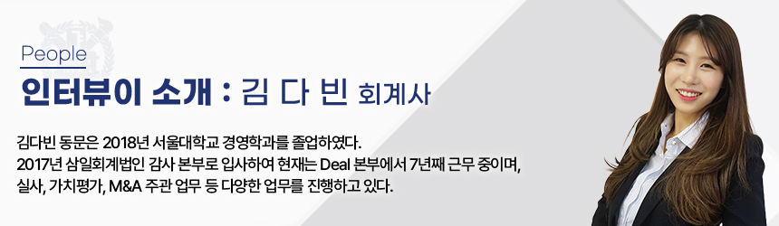 김다빈 회계사님) 저는 Deal 본부 Transaction Service팀 김다빈입니다. 감사본부로 입사하여 1년 6개월가량 업무를 경험한 후 Deal 본부로 transfer하여 7년 차로 근무 중입니다. 현재는 인수 기업 혹은 매각 기업의 재무 실사를 비롯하여 M&A 주관 및 Valuation 등 다양한 M&A 관련 업무를 수행하고 있습니다.