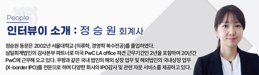 정승원 회계사님) 저는 글로벌본부 소속 정승원입니다. 주로 X-border IPO업무와 회계 자문, 회계 감사를 담당하고 있습니다. 2003년에 삼일회계법인에 입사하여, 근무한지 벌써 20년이 되었습니다. 대부분의 근무 시간을 쿠팡을 비롯한 미국 상장사들, 해외 IPO를 꿈꾸는 한국의 유니콘 기업들, 해외 각국에서 한국 IPO를 준비하는 기업들과 보내고 있습니다.