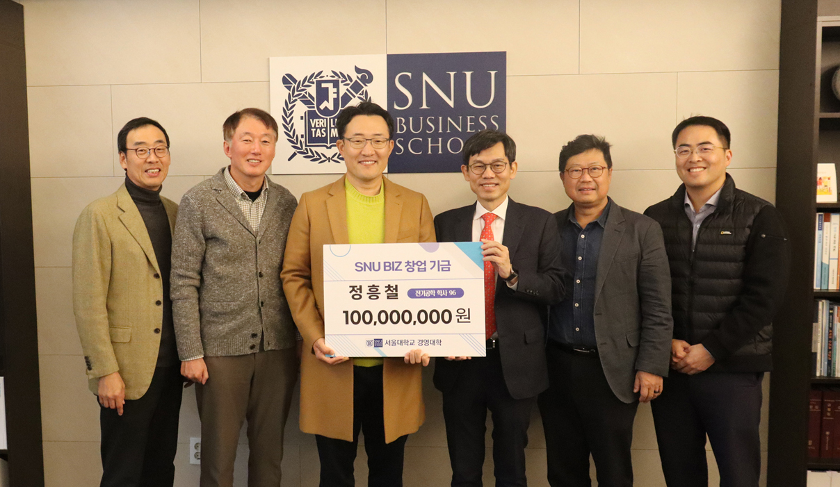 지난 12월 18일, 브릿지인베스트먼트 정흥철 대표는 서울대학교 경영대학을 방문하여 1억원의 발전기금 출연을 약정했다. 약정식에는 브릿지인베스트먼트 정흥철 대표와 서울대학교 경영대학의 김상훈 학장, 최종학 부학장, 김우진 부학장, 이영민 교수, 이준만 교수가 참석했다. 정흥철 대표는 서울대학교 전기공학과에서 학사를 마치고 산업은행과 NHN인베스트먼트에 재직하였으며 현재는 브릿지인베스트먼트를 창업하여 창업가 발굴의 길을 걷고 있다. 이 기금은 SNUbiz 창업기금으로 사용될 예정이다.