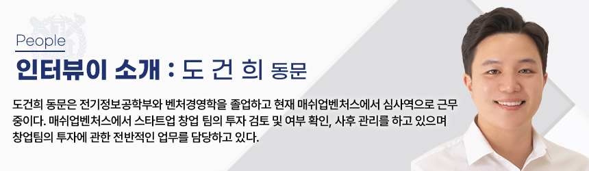 도건희) 저는 무언가 하나를 깊게 파는 걸 잘 못하는 성격이라 여러 가지를 경험하는걸 좋아해요. 또 사람들과 어울리는걸 좋아해요. 이런 제 성격에 매일매일 누군가 새로운 사람을 만나고 여러 가지를 경험할 수 있는 VC 심사역이 잘 맞는다고 생각 들어요.