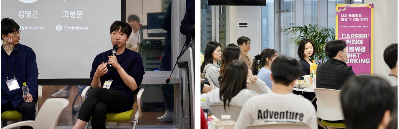 지난 5월 7일 서울대학교 경영대학 59-1동 5층 벤처경영기업가센터에서 <커리어 네트워킹> 행사가 열렸다. 벤처경영기업가센터와 KrewCapital이 공동주최한 이번 행사는 8명의 청년 창업가들이 멘토로 참여하여 고군분투한 성장 이야기와 미래 창업을 꿈꾸는 학생들에게 멘토링을 진행하였다.